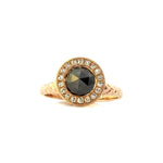 A diamond halo and side accents containing 18 round brilliant-cut white diamonds (approximately 0.17CTW VS/GH) surround this showstopping 6mm black rose-cut diamond with 2 accent black diamonds on sides. Available in 14KT white, yellow, or rose gold. Wear it on its own or as part of a stack!