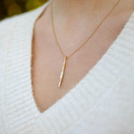 A 1.5-mm round white diamond accents the Bound Spear necklace, available in brushed or high-polish 14KT yellow, rose, or white gold. The pendant is 40mm long by 3.5mm wide and comes on a 20" fine cable chain.