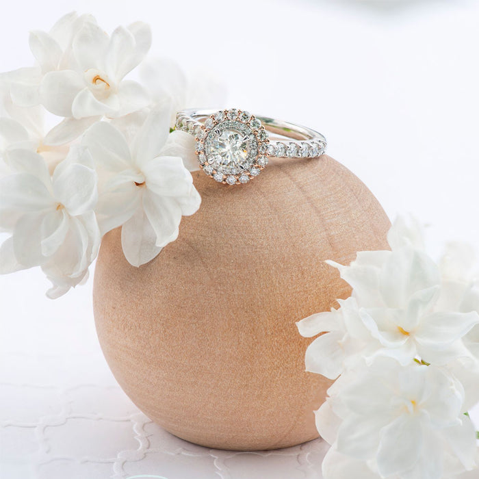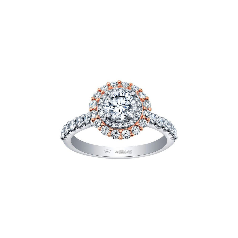 Representing love, life, peace, and purity, the water lily symbolizes perfectly eternal devotion. A round brilliant-cut Canadian centre diamond scintillates within a double halo crafted from 18kt rose Canadian Certified Gold and 18kt Pure White™. Diamond sides add even more fire and brilliance.