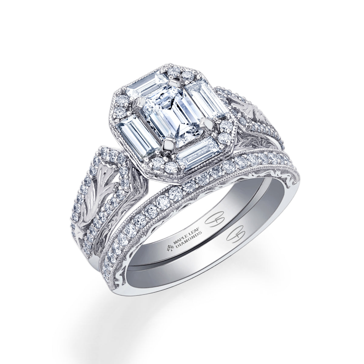 Experience the magic of nature with the touch of frost on the window. Admire the stunning emerald-cut Canadian centre diamond, accentuated by frost-inspired engravings. The halo shines with baguette and round diamonds, while a regal blue sapphire adds a pop of color. Handcrafted with 18kt Pure White™ for an exquisite finish.