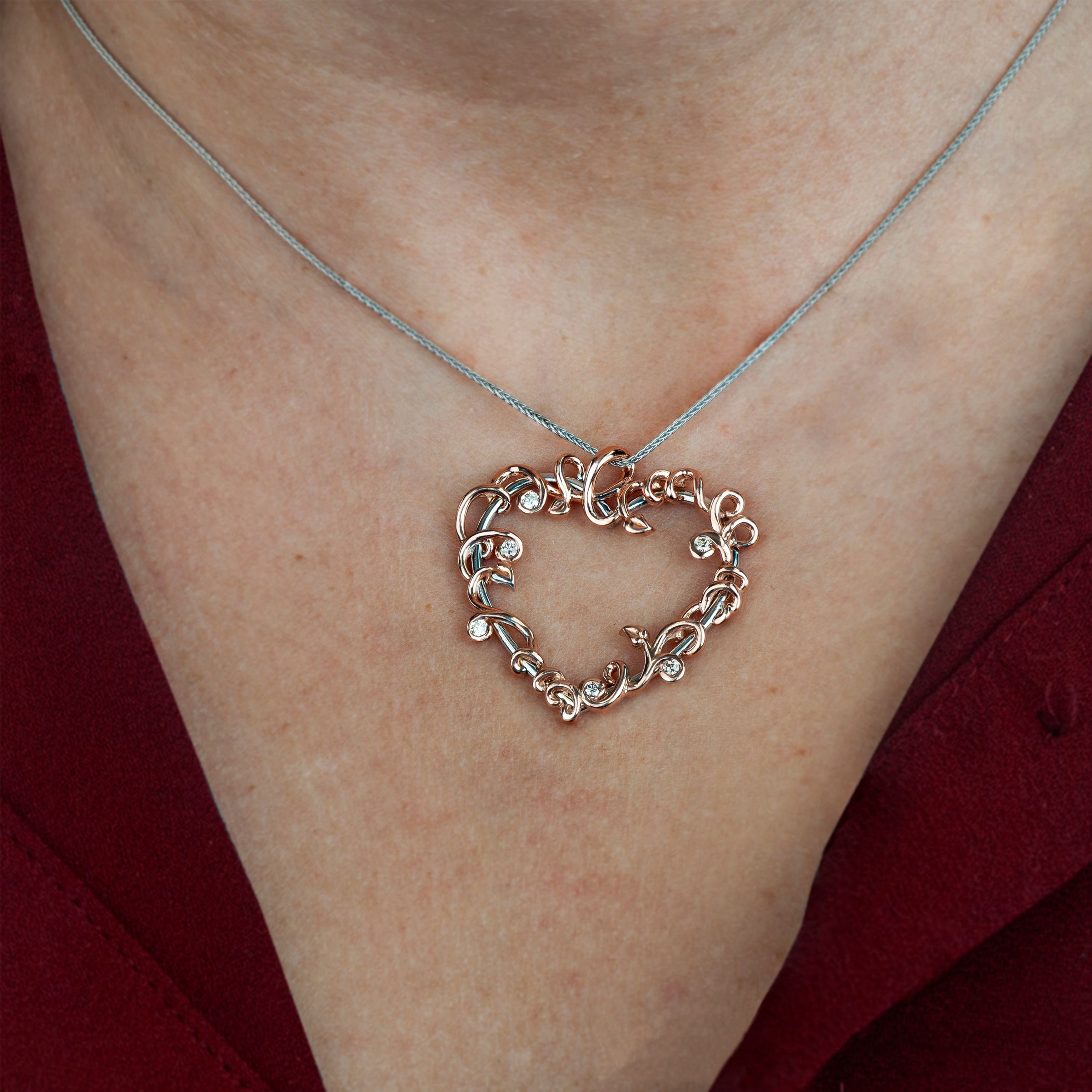 Symbolizing fidelity, love and friendship, this golden ivy grows strong and true. Crafted in 14KT Canadian Certified Gold, this vine entwines a perfect heart...love's most enduring symbol. Round brilliant-cut Canadian diamonds of 0.12CT total weight add the perfect sparkle for this beautiful pendant. Chain adjusts to 16", 17" 18".