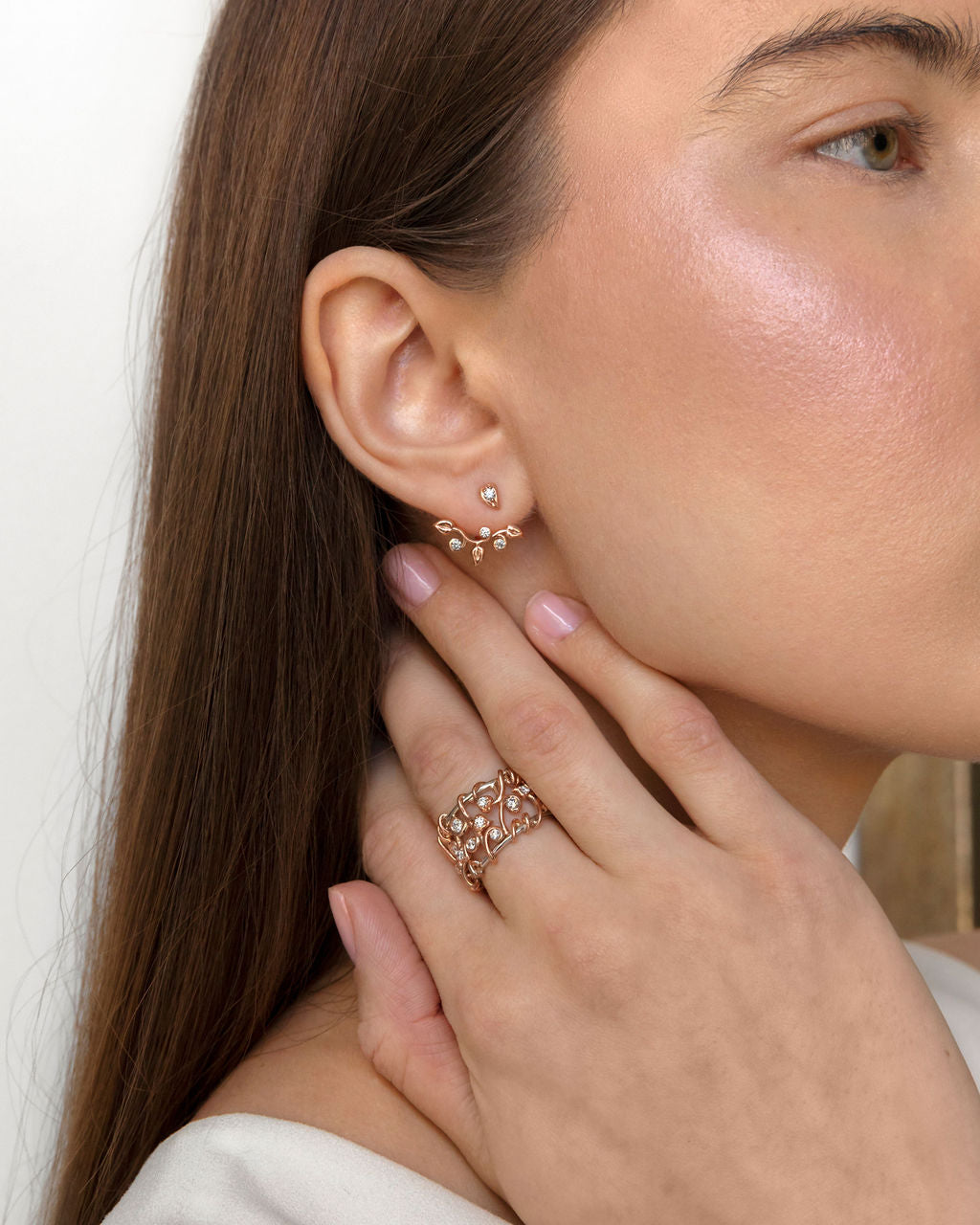 Climbing upward as they reach for the sun, evergreen ivy stems cascade over a garden wall, creating the backdrop for the blossoming colours of spring to come. These 14KT Canadian Certified Gold enhancers and studs are set with round brilliant-cut Canadian diamonds. (Sold together)