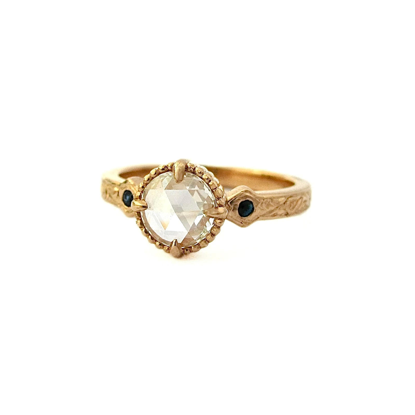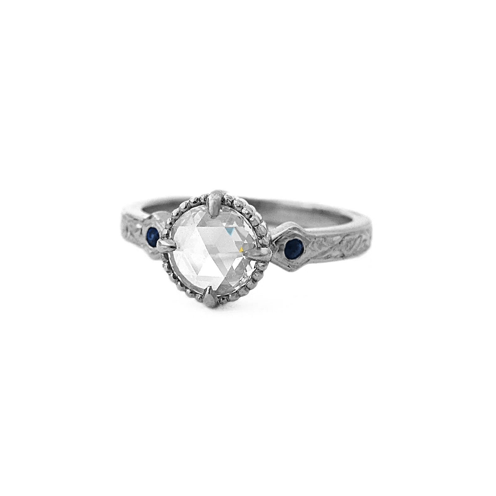 An exquisite 6.5-mm rose-cut diamond is the centre of Vintage Opulence 'Heather,' its presence as breathtaking as that of a round brilliant-cut diamond of comparable width. Two blue sapphires add a touch of regal flair to this hand-engraved beauty.