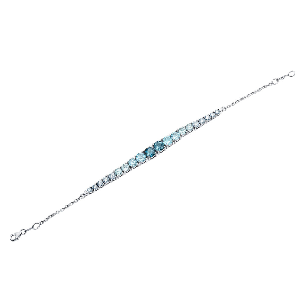 14 karat Canadian Certified Gold london blue topaz tennis bracelet set with 1.50 carat total weight round brilliant cut Canadian diamonds and london blue topaz & blue topaz & sky blue topaz.