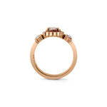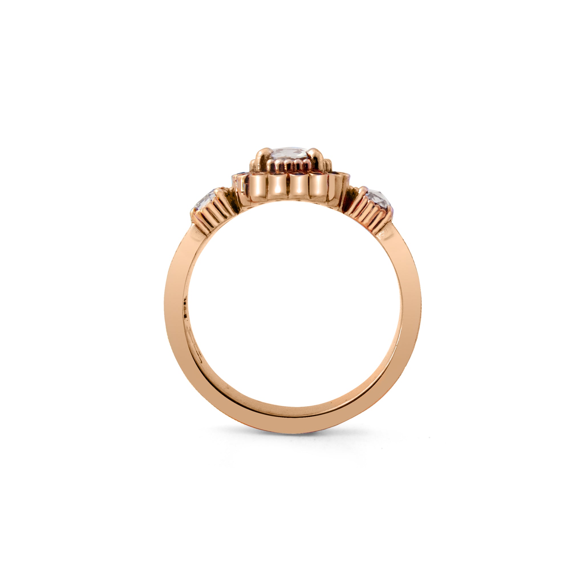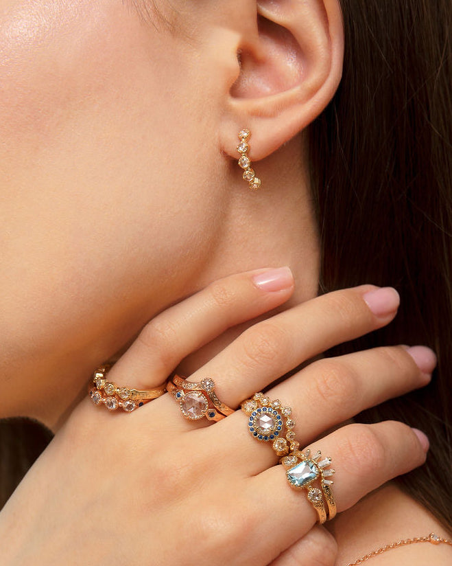 Indulge in the luxury of hand-engraved gold, combined with the vintage style rose cut diamonds. This 14kt gold ring has a 5-mm white rose-cut centre diamond and two 3-mm rose-cut diamond sides. Majestic blue sapphires form a rich halo to complete this gorgeous ring. “Jacqueline” fits perfectly with Hannah, Elizabeth and Violet to create a stack that’s all your own!