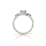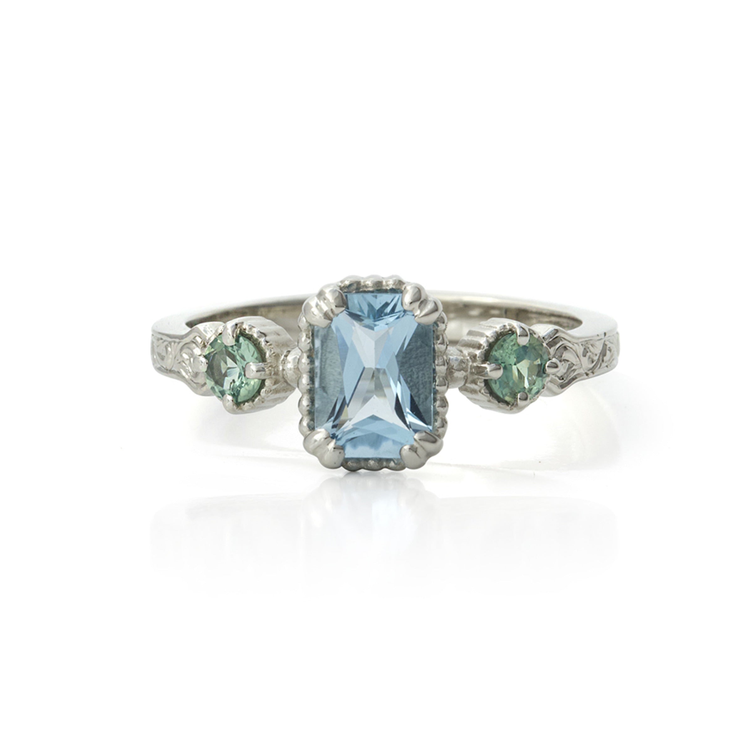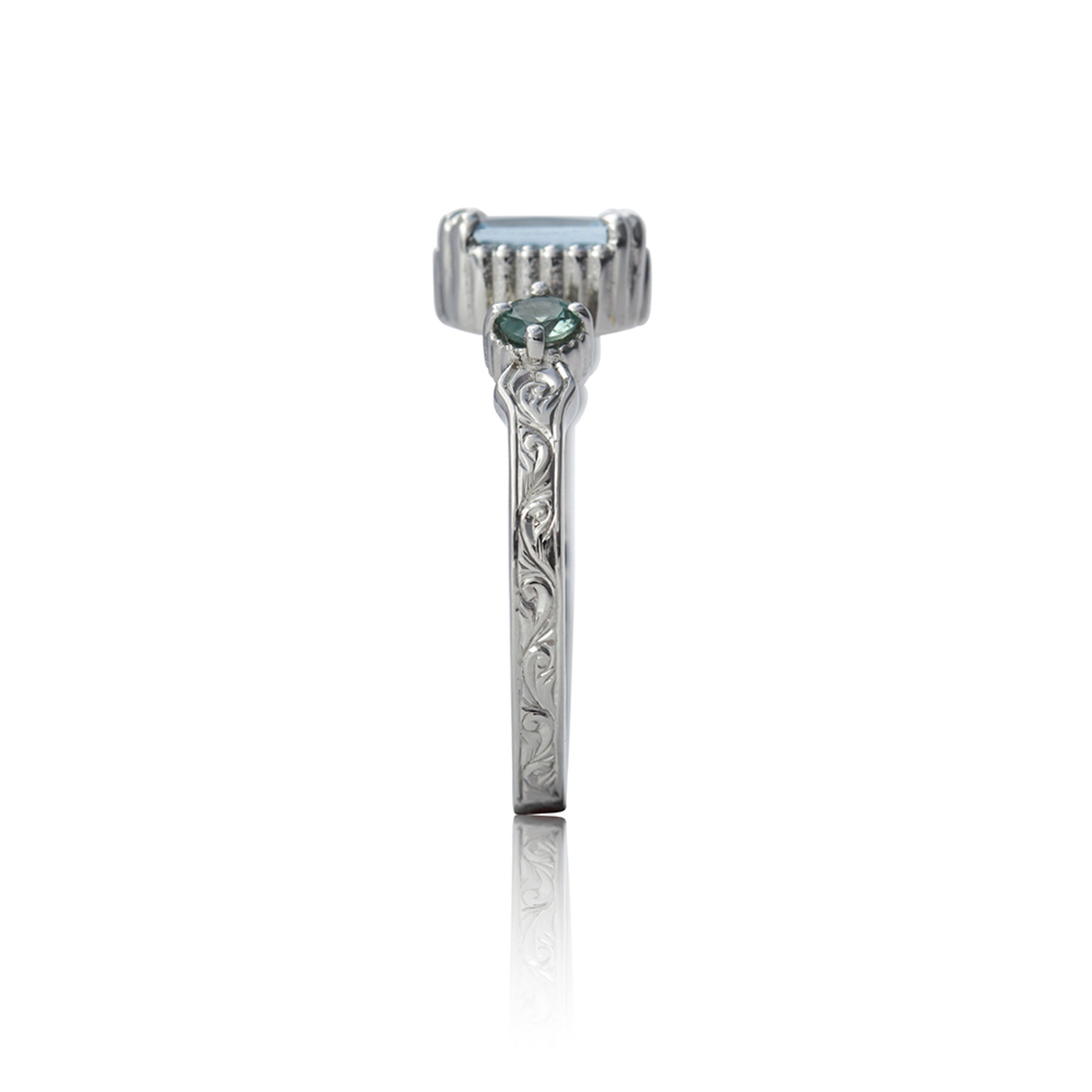 Soar into the sky blue of a 5mm x 7mm emerald cut aquamarine, shining between two exquisite 3mm round Alexandrites! Hand-engraved 14KT yellow gold enhances the vintage aesthetic of this beautiful ring.