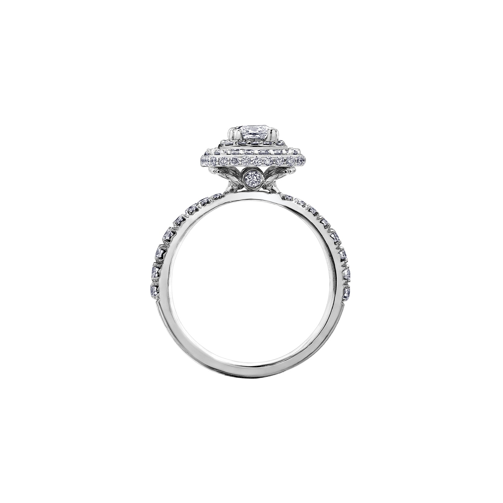 Maple Double Halo Ring features a 0.50ct cushion cut certified Canadian Diamond surrounded by a rose gold halo and another white gold diamond halo for a total of 1.30 TCW. Two rose gold maple leaves delicately curl into the diamond studded band to create a special detail that makes this a one-of-a-kind engagement ring! Amber gold and rust-coloured leaves fall to the ground, the unmistakable scent of autumn heavy in the wind. Winter is approaching, but not before streets, forests, and hillsides are aflame with nature’s brightest and most vibrant colours.