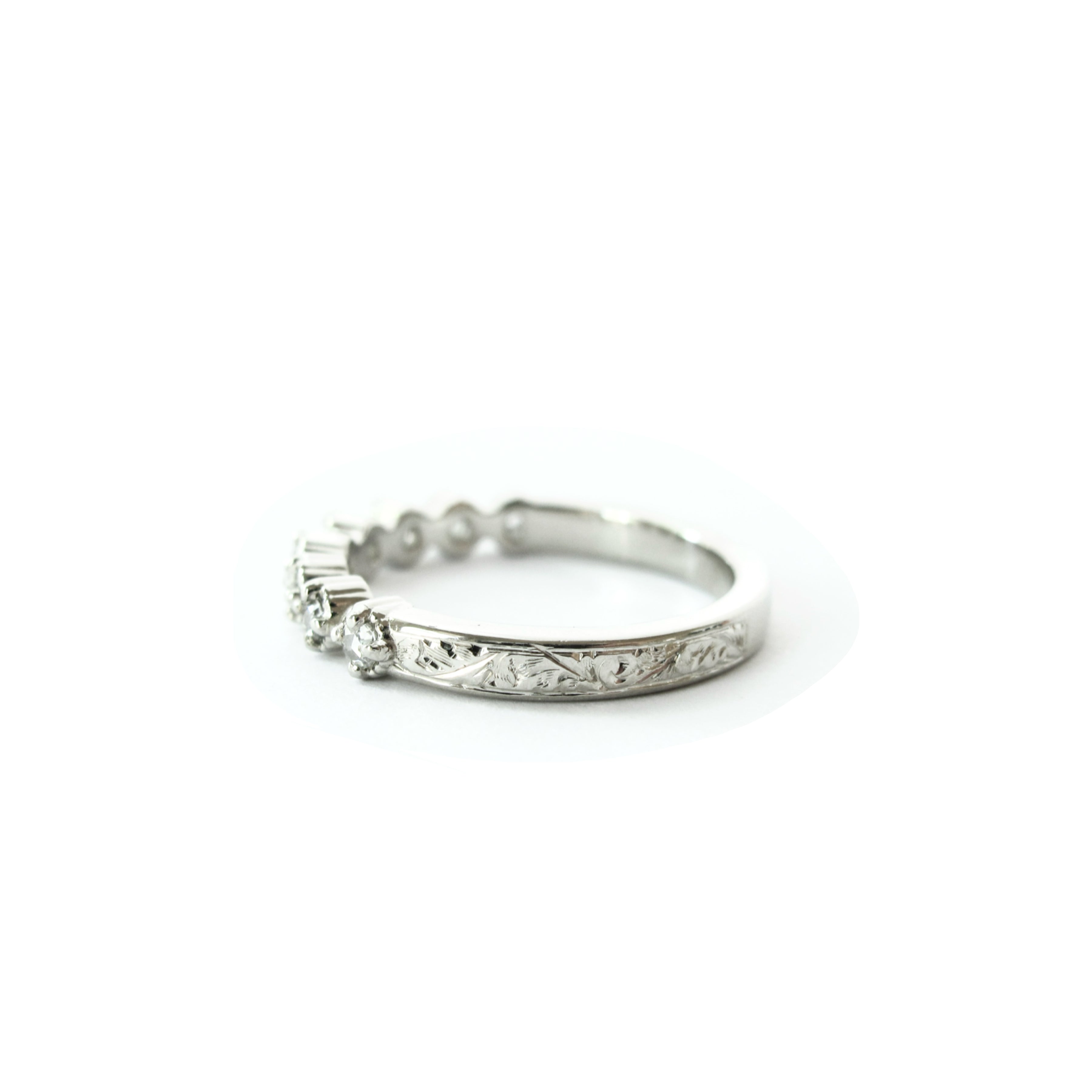 An exquisite half eternity 14k gold band featuring eight 2.2mm round white rose-cut diamonds in cupcake settings with hand-engraving on shoulders leaving room for sizing at bottom.