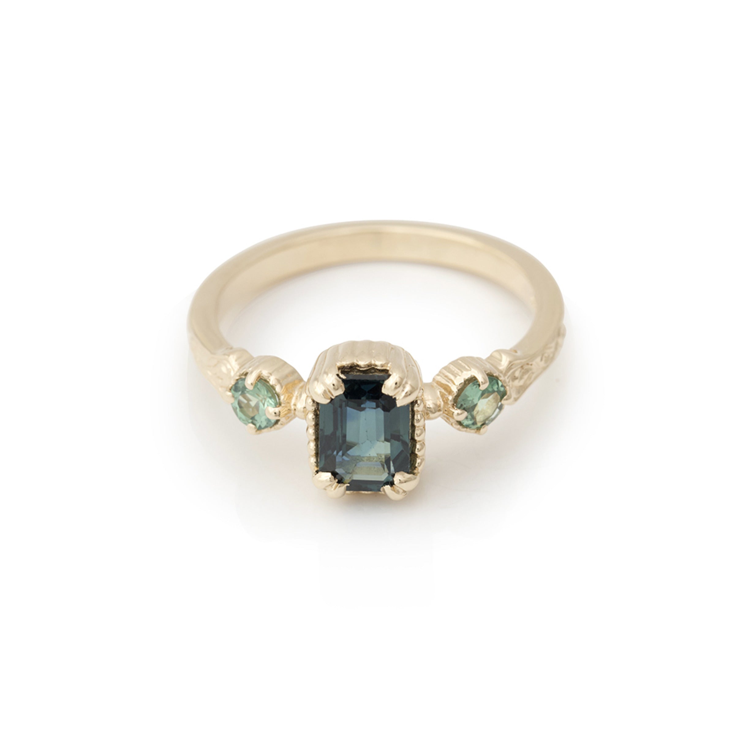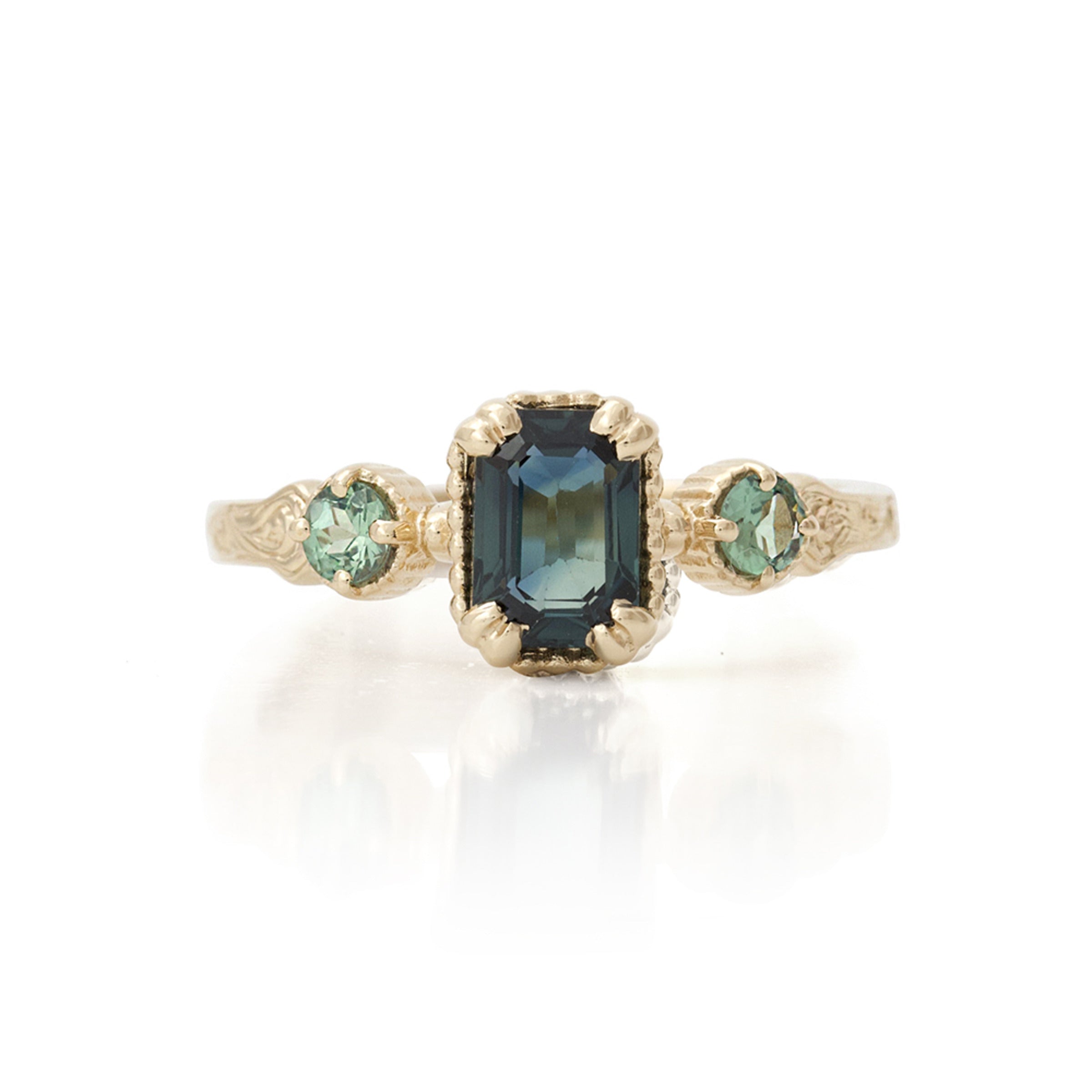 Dive into the ocean blue of a gorgeous 5mm x 7mm emerald cut Montana blue sapphire, sparkling between two exquisite 3mm round alexandrites! Hand-engraved 14KT yellow gold enhances the vintage aesthetic of this beautiful ring.