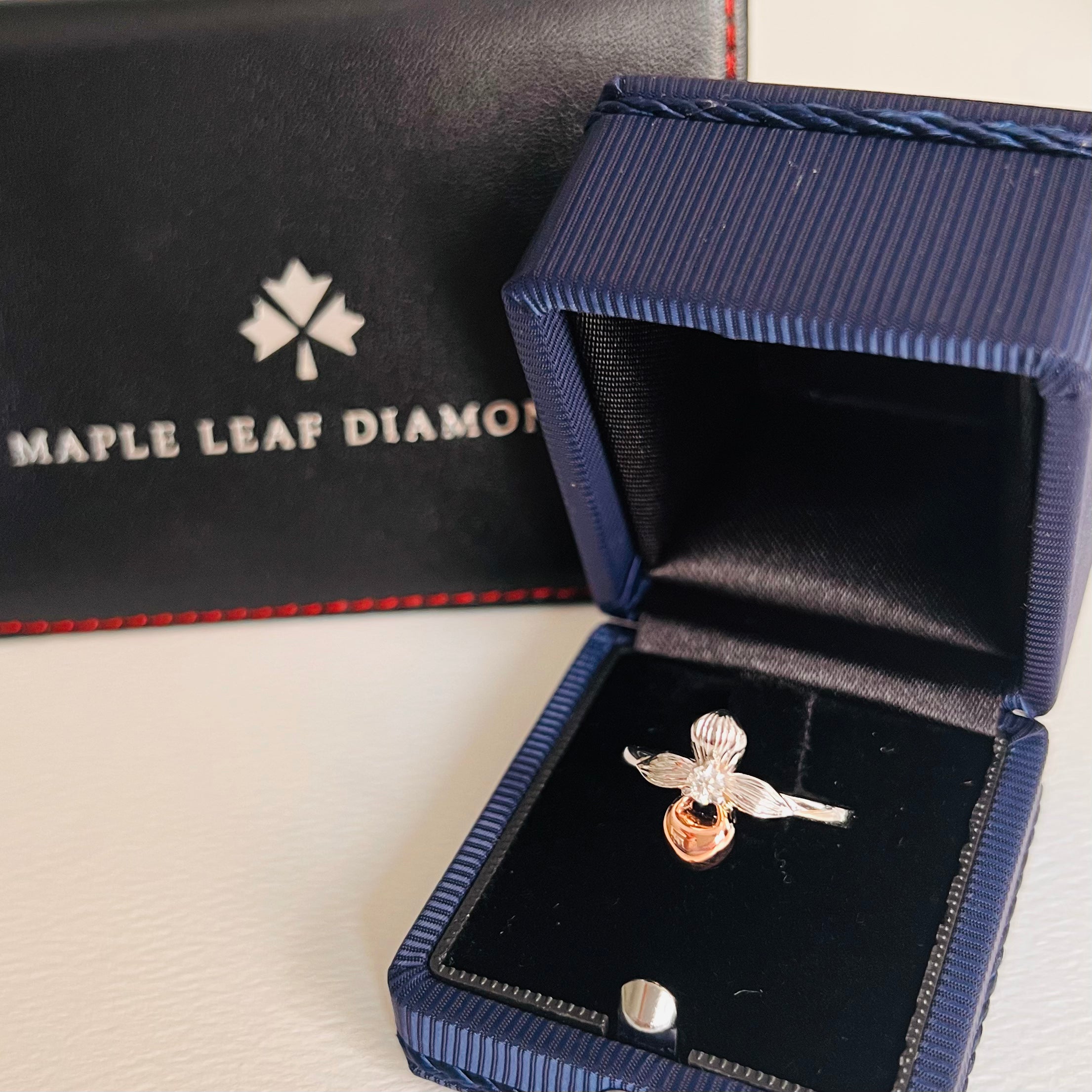 Crafted in 14KT rose and white Certified Canadian Gold, this ring features a Prince Edward Island lady's slipper flower set with a round brilliant-cut Canadian diamond