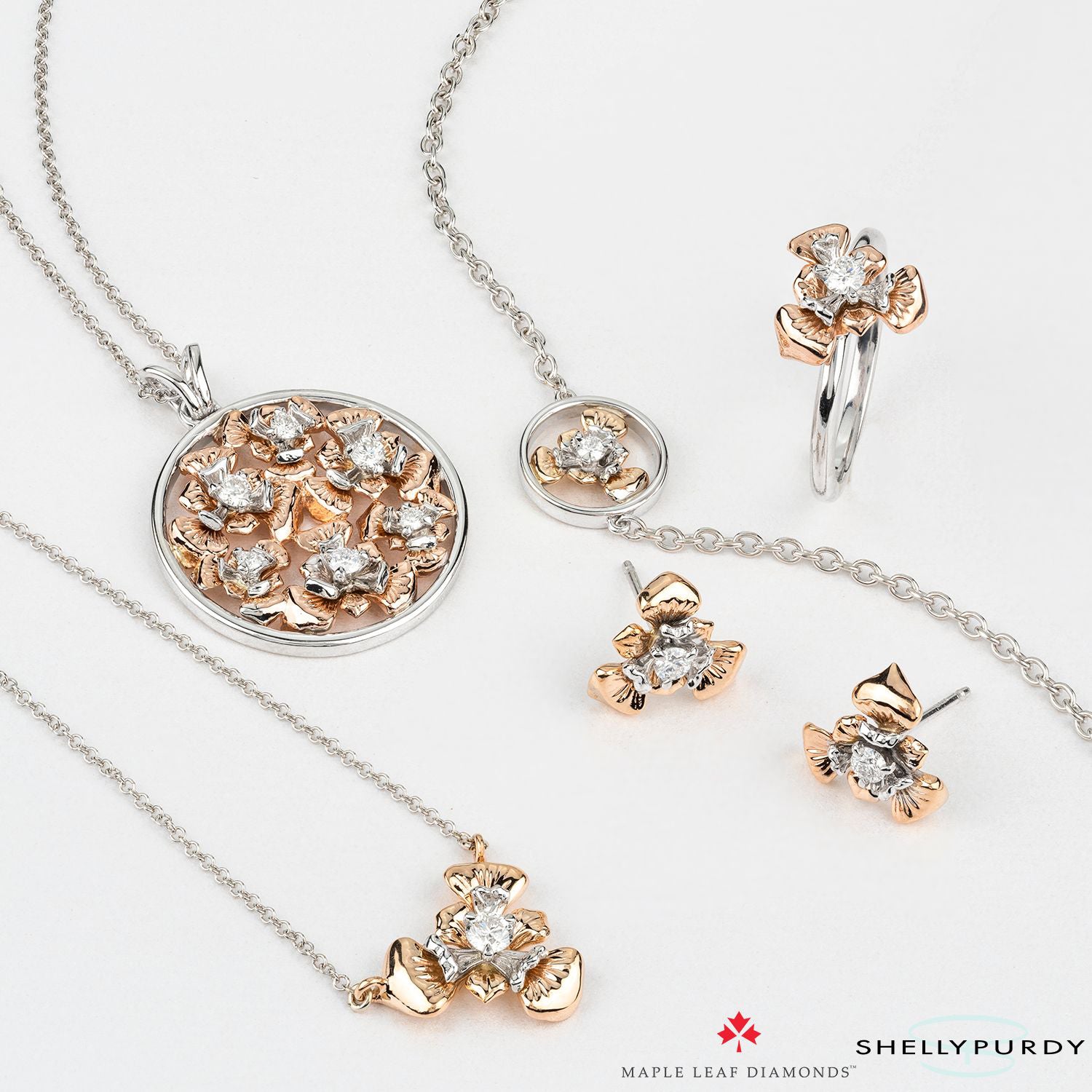 Canada's provincial and territorial flowers are the inspiration behind a new jewellery line by award-winning Toronto designer Shelly Purdy. Crafted in 14-karat Canadian Certified Gold and featuring ethically sourced Canadian diamonds, this collection is the latest collaboration between Shelly Purdy and Maple Leaf Diamonds™.