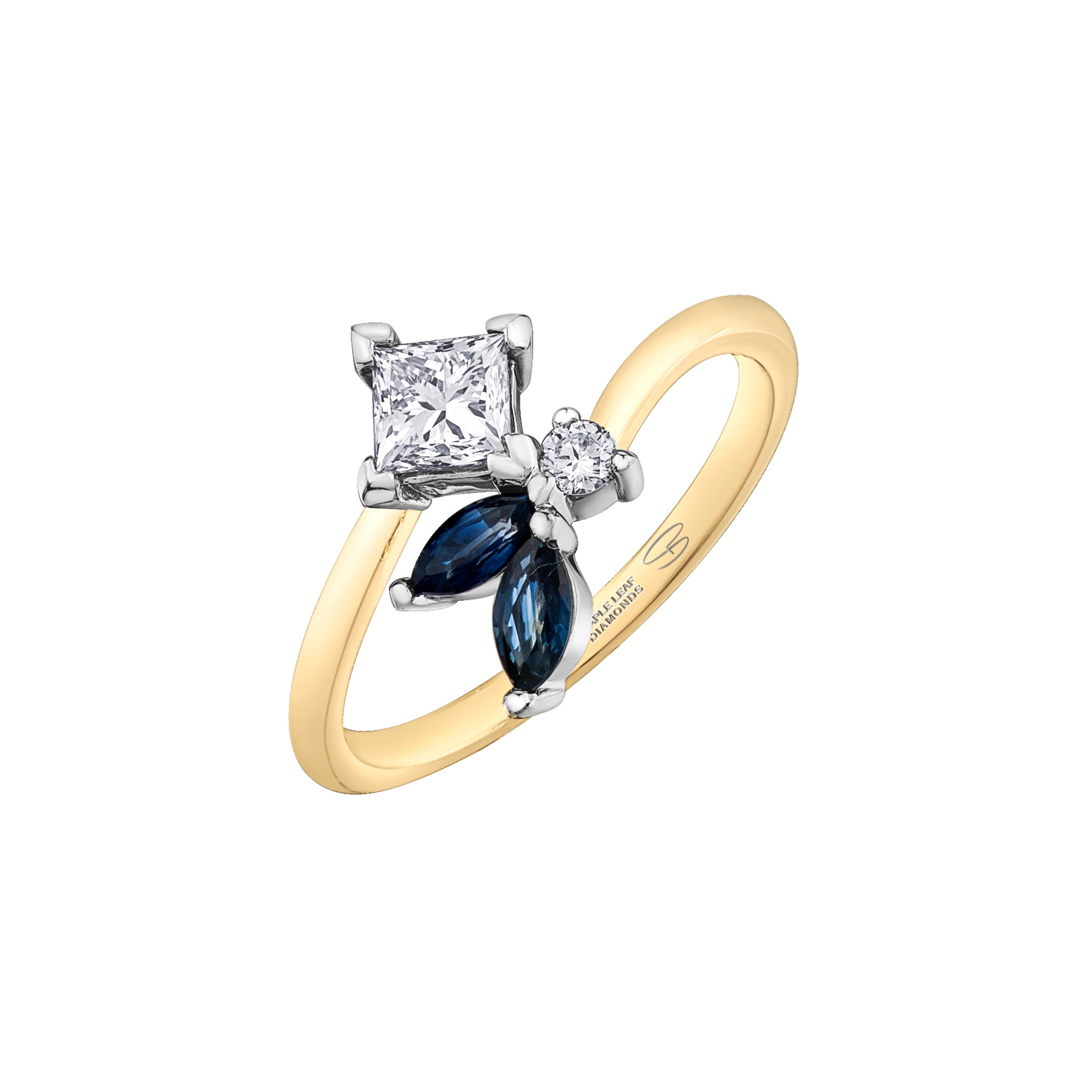 The flirty Wild Princess Ring has a 0.50CT princess-cut with 0.05CT round brilliant-cut with two blue marquise-shaped sapphires. Available in 14KT yellow and white or rose and white or all white Certified Canadian Gold.