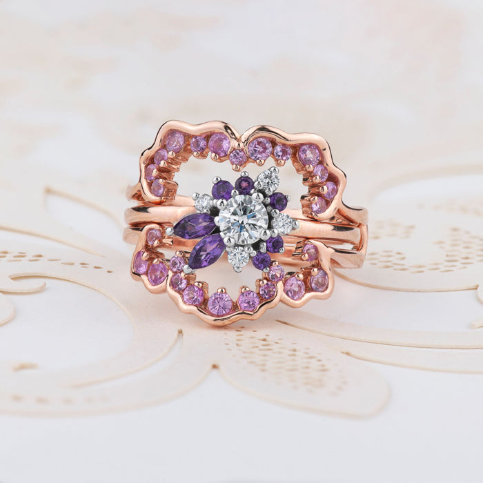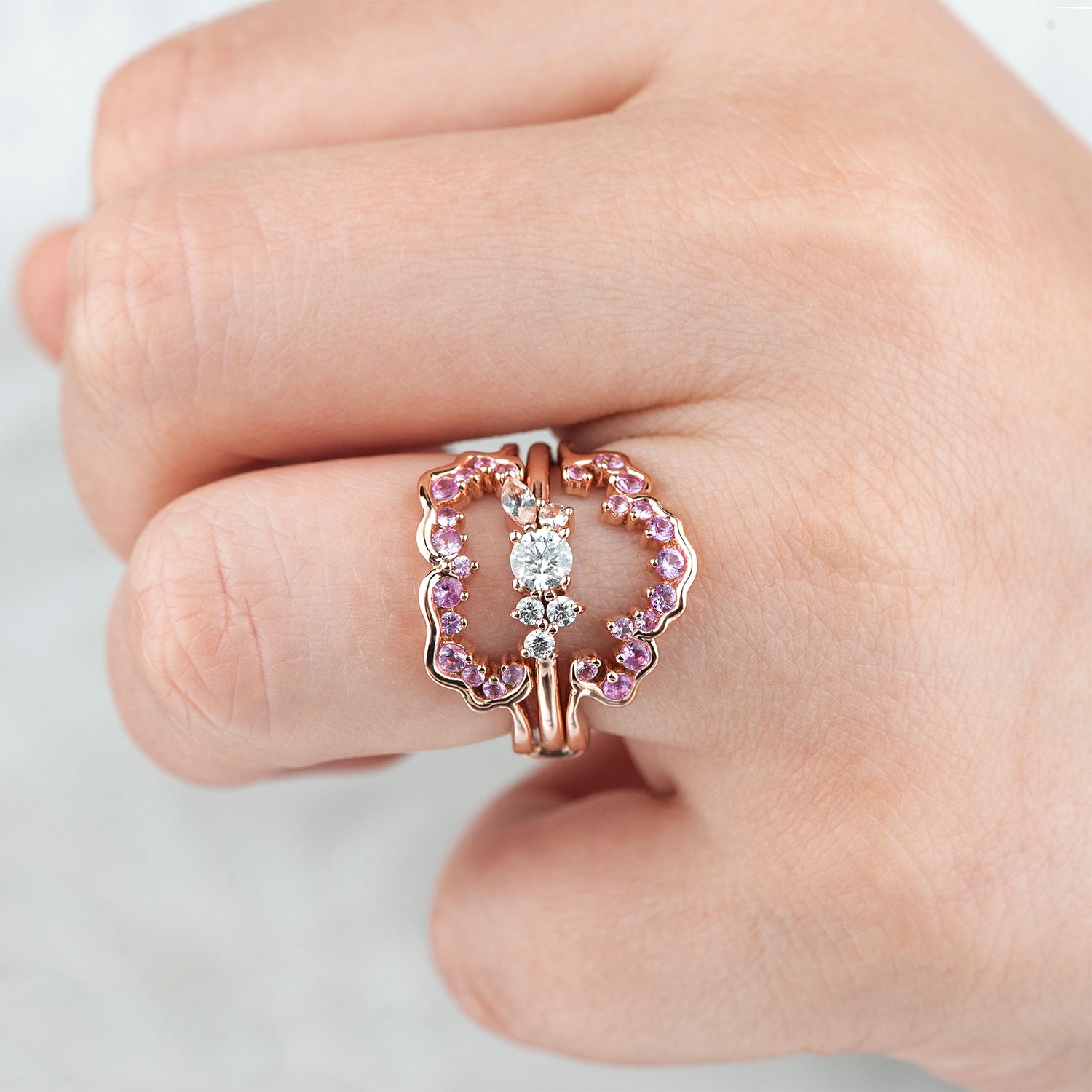 As winter in Canada comes to an end, the soil begins to sprout with life. Watch as wildflowers of every colour imaginable cover the Canadian landscape. Crafted in 14KT Canadian Certified Gold, this flower inspired jacket ring is set with pink sapphires and made to accompany the Wildflower Ring.
